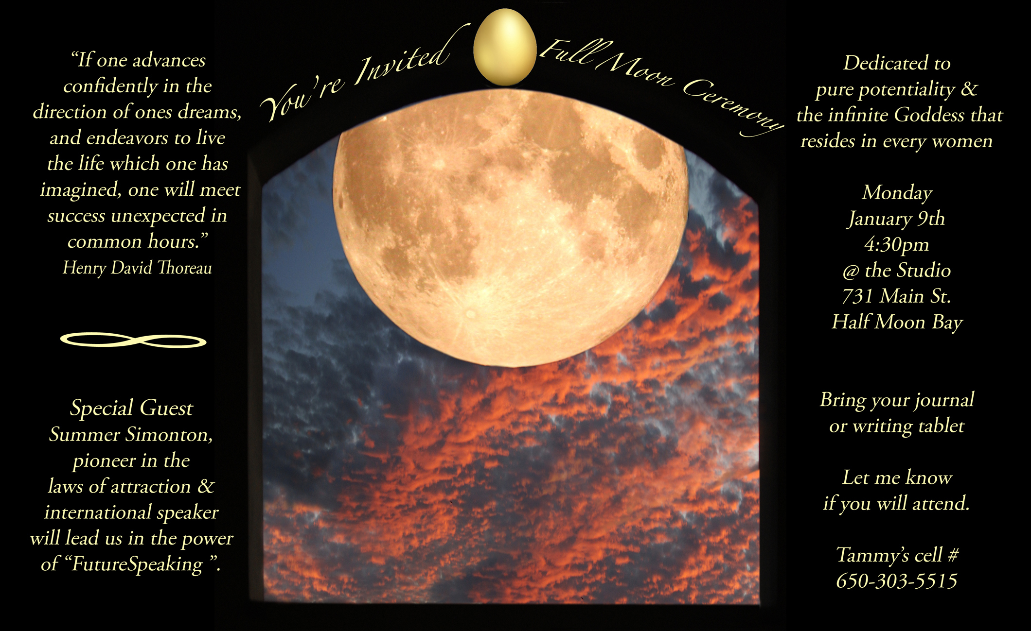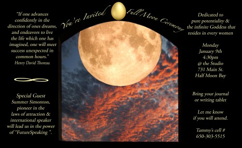 The first full moon ceremony of 2012 will be dedicated to your pure potentiality and the infinite Goddess that resides in all women. We will be honored by a special guest Summer Simonton. She is a pioneer in the laws of attraction and international speaker. She will lead us in the power of “FutureSpeaking”. Bring your journal or writing tablet.
