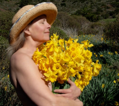 Amy could not come with us to Stillheart because she needed to attend her father’s memorial service. So the day before the full moon, Amy, Mary and I collected wild daffodils to gift the women of Stillheart. Amy had never been to Daffodil Vally. I just giggled as I saw her GLEE when she stepped into the wild flower bed. We were on a mission to collect daffodils to bring to Stillheart. It didn’t take long, there were thousands to choose from. With that done we couldn’t help but play with Mother Earth’s bounty.