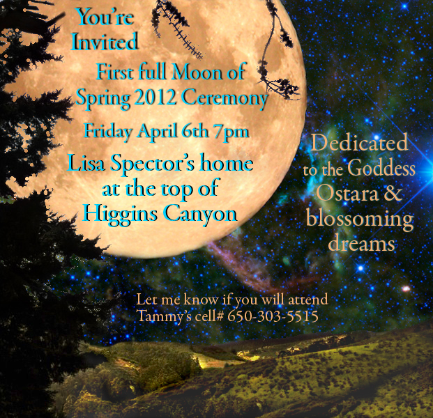 We welcome Spring with ceremony, art and creative action. The first full moon ceremony of Spring will be on Passover, Good Friday, April 6th. Our circle will be held at Lisa Spector’s beautiful bluff top property at the top of Higgins Canyon, Half Moon Bay. Call me if you need direction. 650-303-5515.