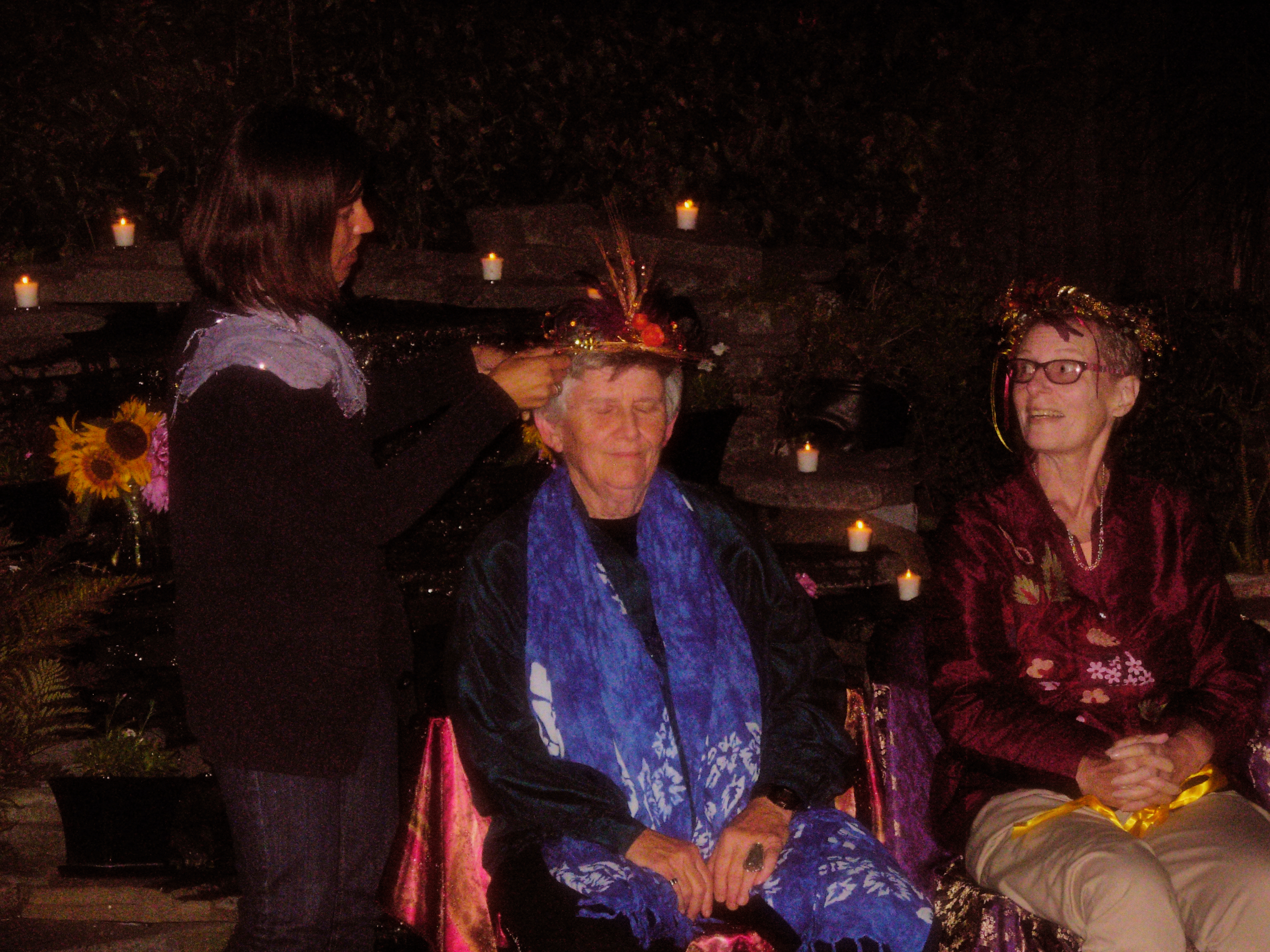 Poised in the midst of flowers, candles, a waterfall, and a clear star-filled sky, Chris and Annette were initiated into Cronedom. Both were crowned and thus transformed from Mothers to Crones.
