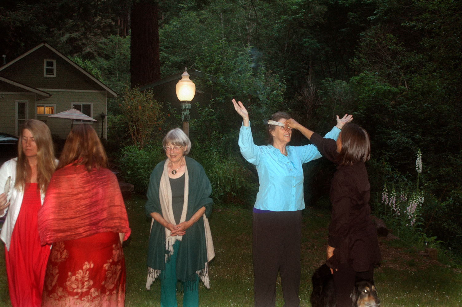 Upon arrival, we each created a prayer flag with words of wisdom and empowerment. We then wove the flags onto a line, braiding shiny beads in with them. The ritual proceeded with our honoring the seven directions, calling in those who could not be present, clearing the energy with sage, and celebrating the lovely women chosen to be born in May. They each presented us with flowers after receiving their blessings from the group.