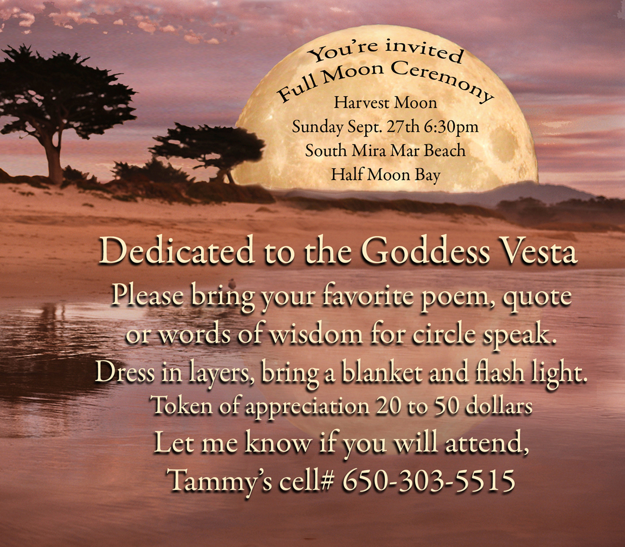 On the harvest moon we will gather at the beach to honor Vesta, Goddess of the hearth. Hope you can join our circle.