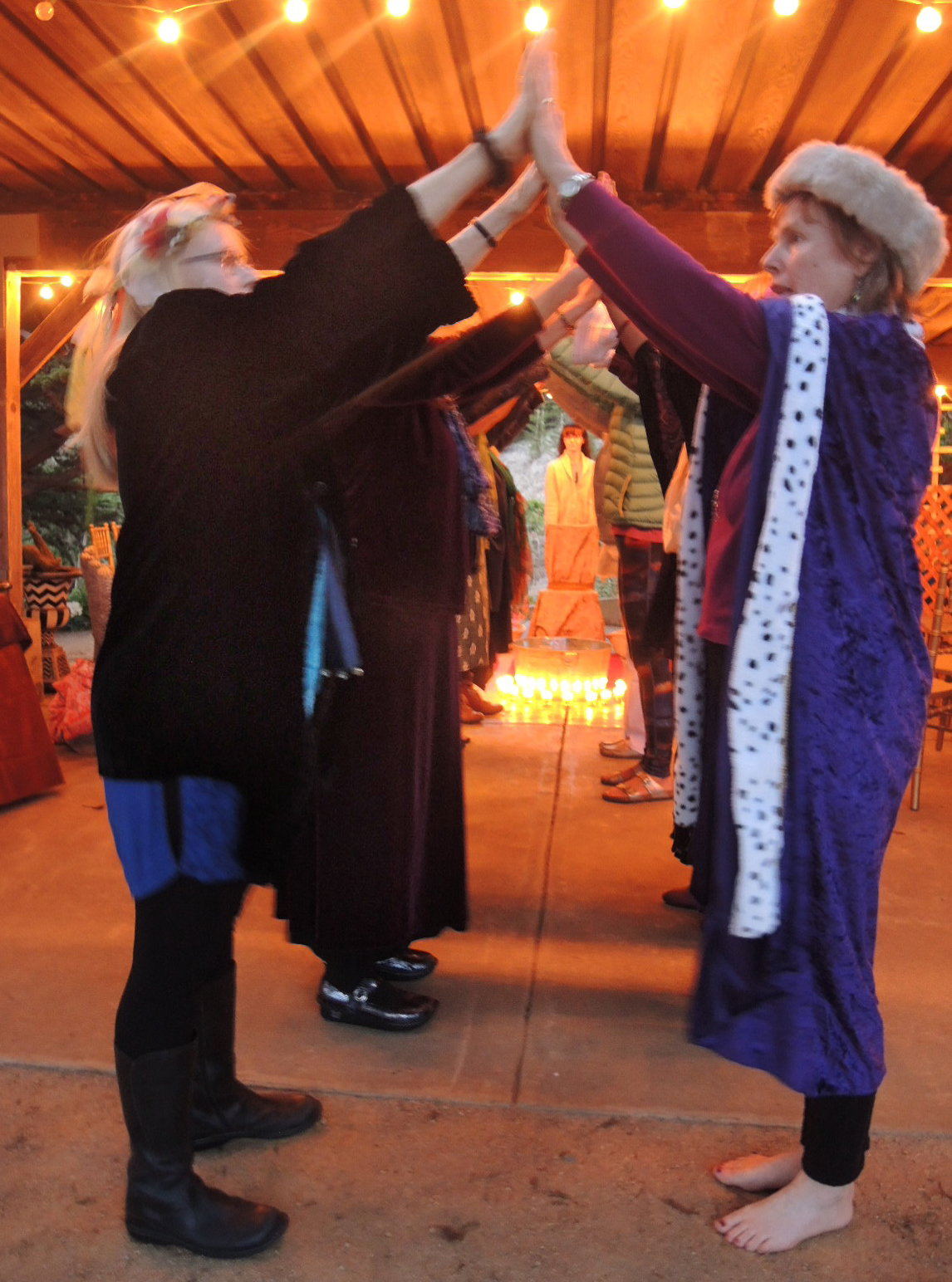 We created the hand bridge portal through which each crone emerged, crossing over fire and through water to arrive at her beautiful throne. Three maidens in service held out to each new crone a wrapped basket. Each one revealed the uniquely crafted crown created specially for each crone.
