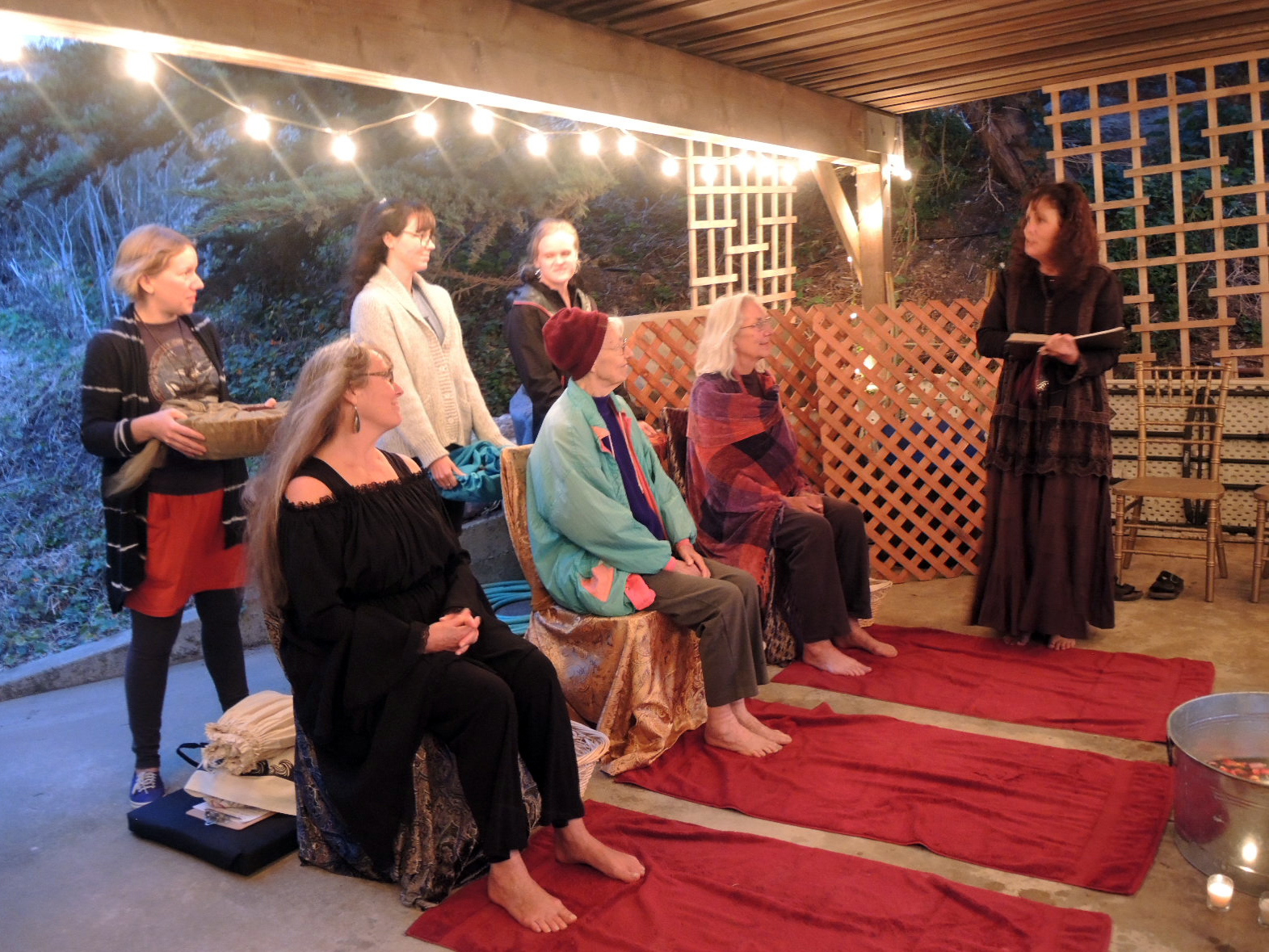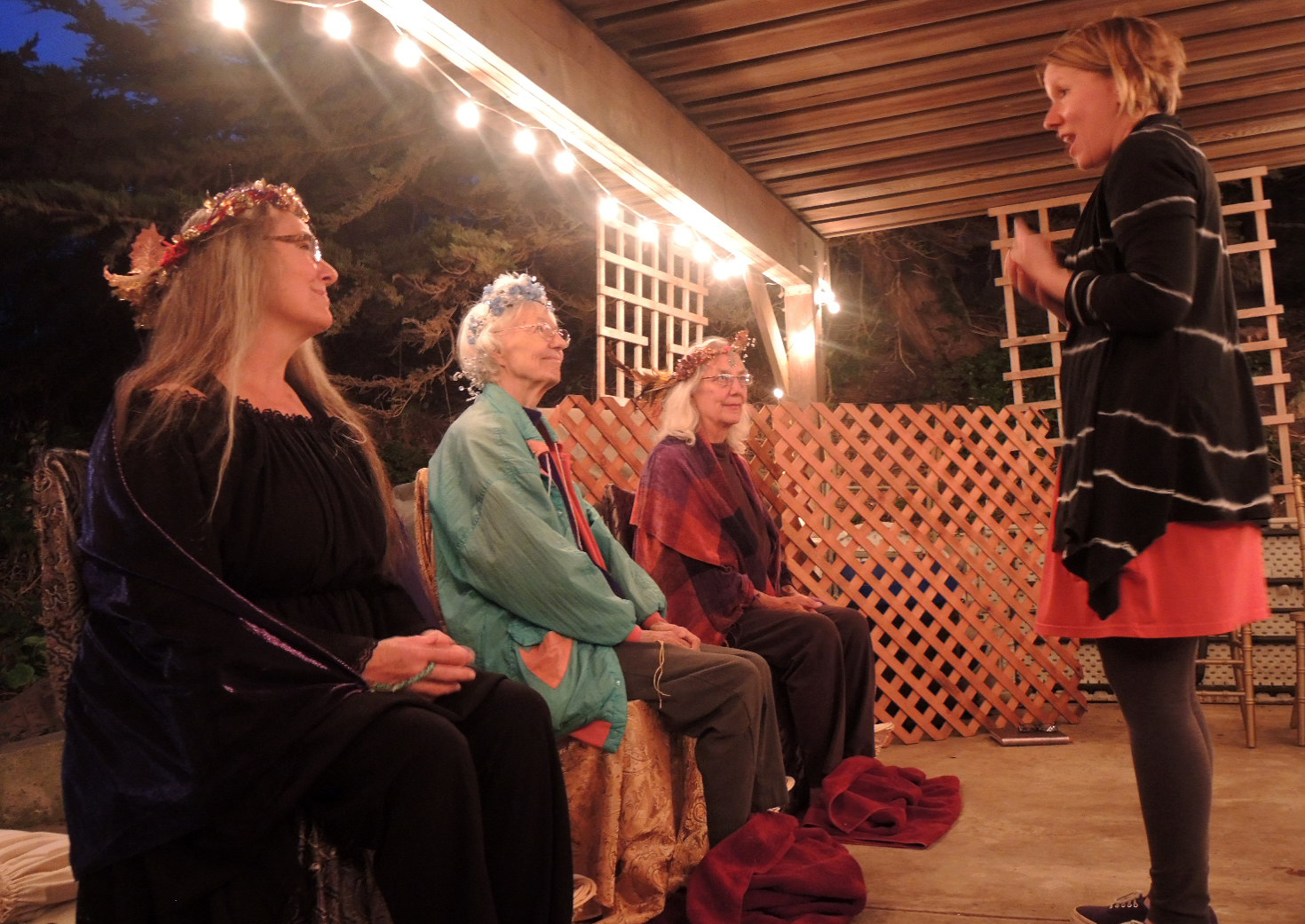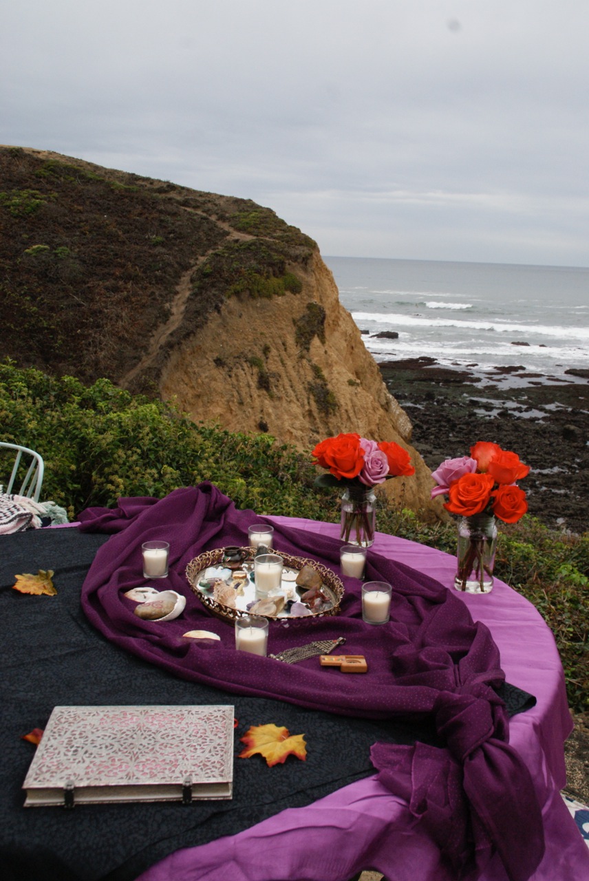 Moon Mothers had much to celebrate as we gathered on the full moon. In our October tradition, we honor Pele the Goddess of fire, and we honor the wise women who are answering their inner calling to be crowned as Crone. This full moon also marked the 75th gathering of the Moon Mothers. Perched on the Moss Beach bluff-top, sacred Seal Cove stretched out below. Mother Ocean breathed upon us as we marveled at her beauty and filled with gratitude for the blessing of our spectacular seaside setting, perfect for the evening’s circles and pageantry. We commenced casting our circle on the ocean view terrace.