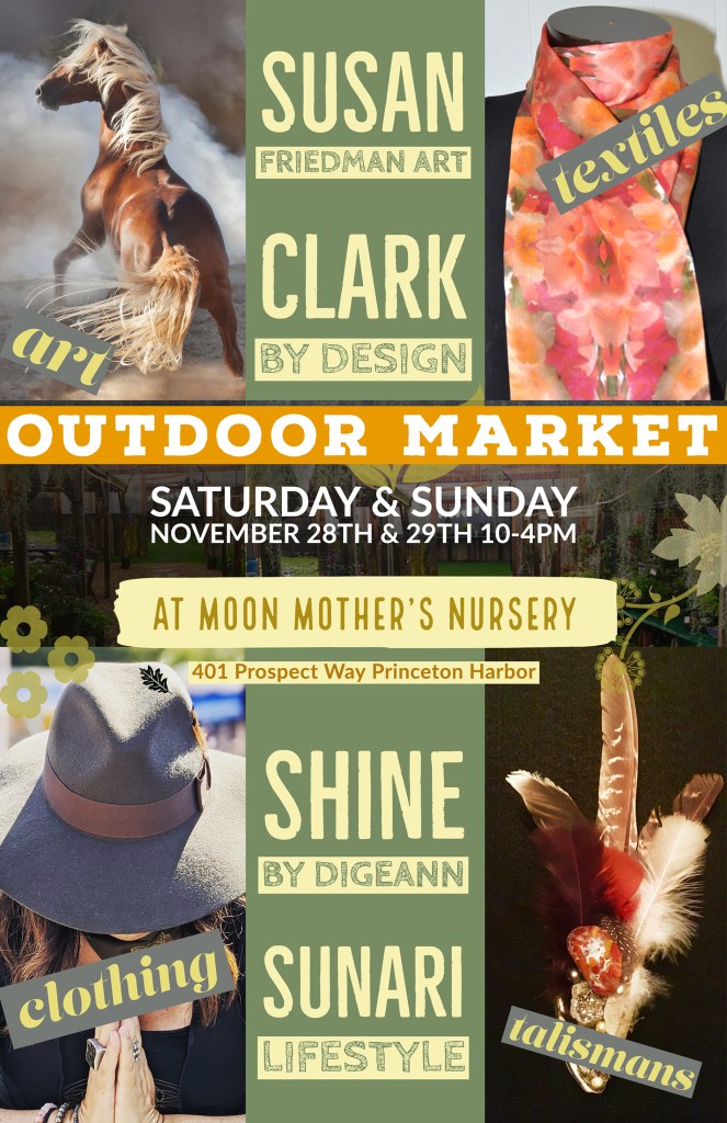 You’re invited to Moon Mothers open air Holiday Market. This year we are featuring four excellent local artists with beautiful one of a kind offerings, there will be plenty of social distancing space and of course you’ll be among plenty of lush oxygenating plants.