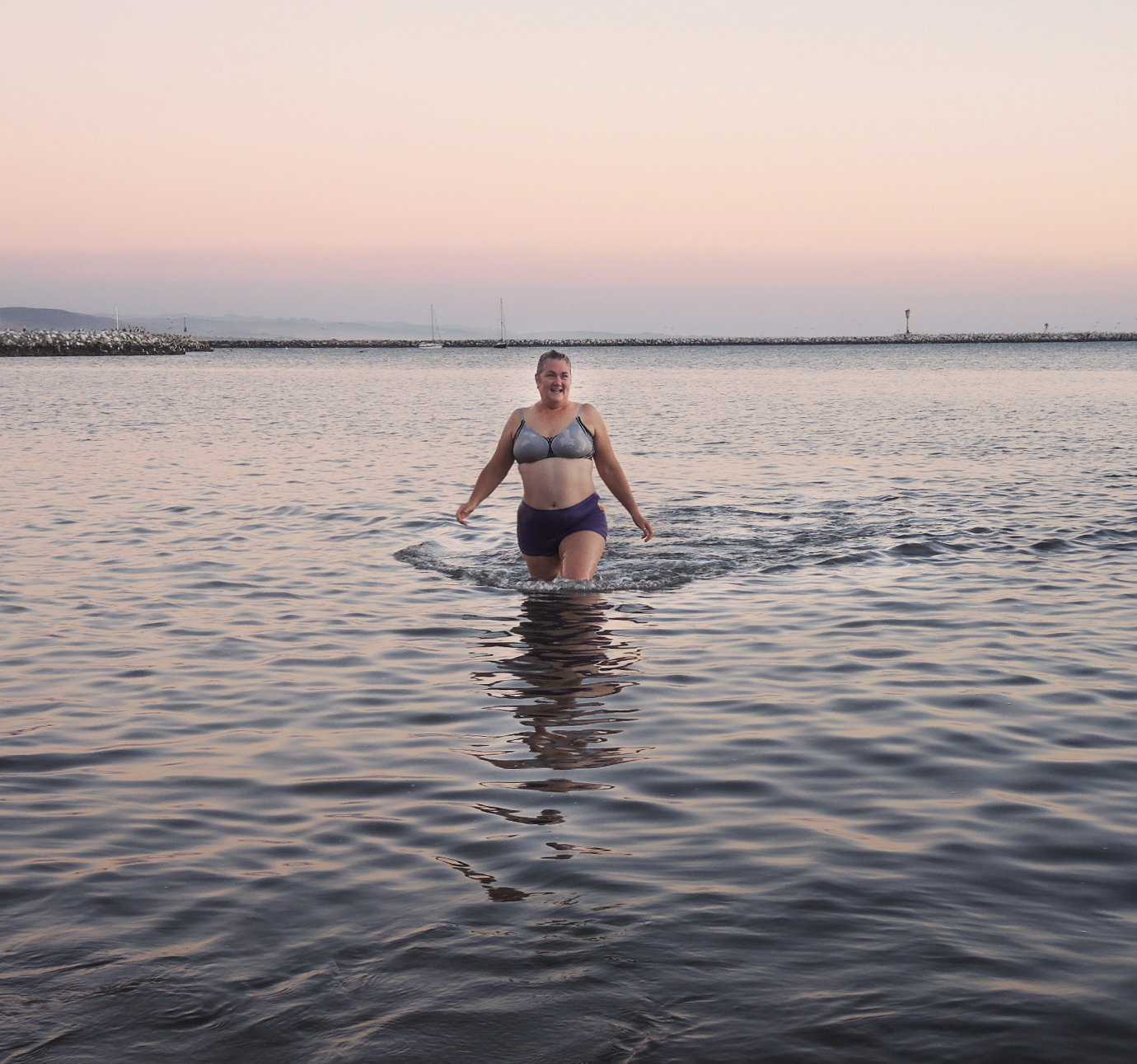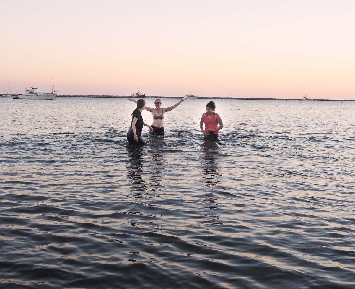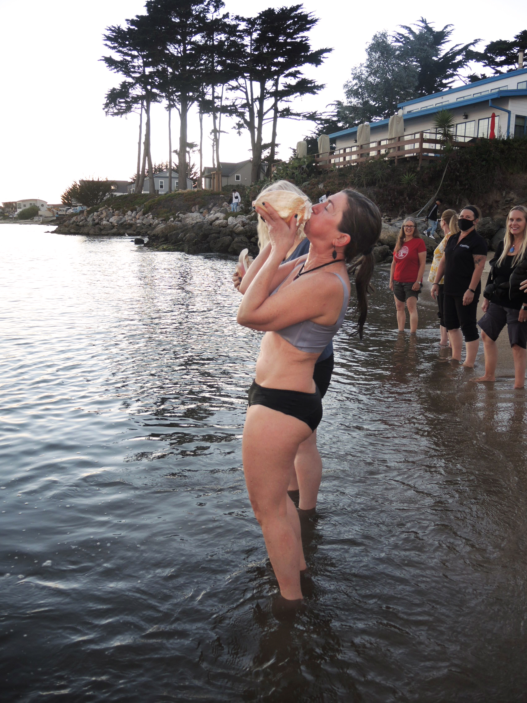 Once re-circled in the sand, Kellie taught the Goddess March song, We all come from the Goddess. Keeping the rhythm and chanting, we marched (swayed) to the ocean. At waters edge the women showed their boldness. Most walked into the water calf deep, blew the conch or kept the chant going. A few BOLD women jumped right in. As I witnessed their bold courage I was astonished. Their action emboldened the others to do the same. The nearby sea lions howled, Moon Mothers cheered joyously for the bold swimmers, conch trumpets rang out in exaltation as we celebrated the moment.