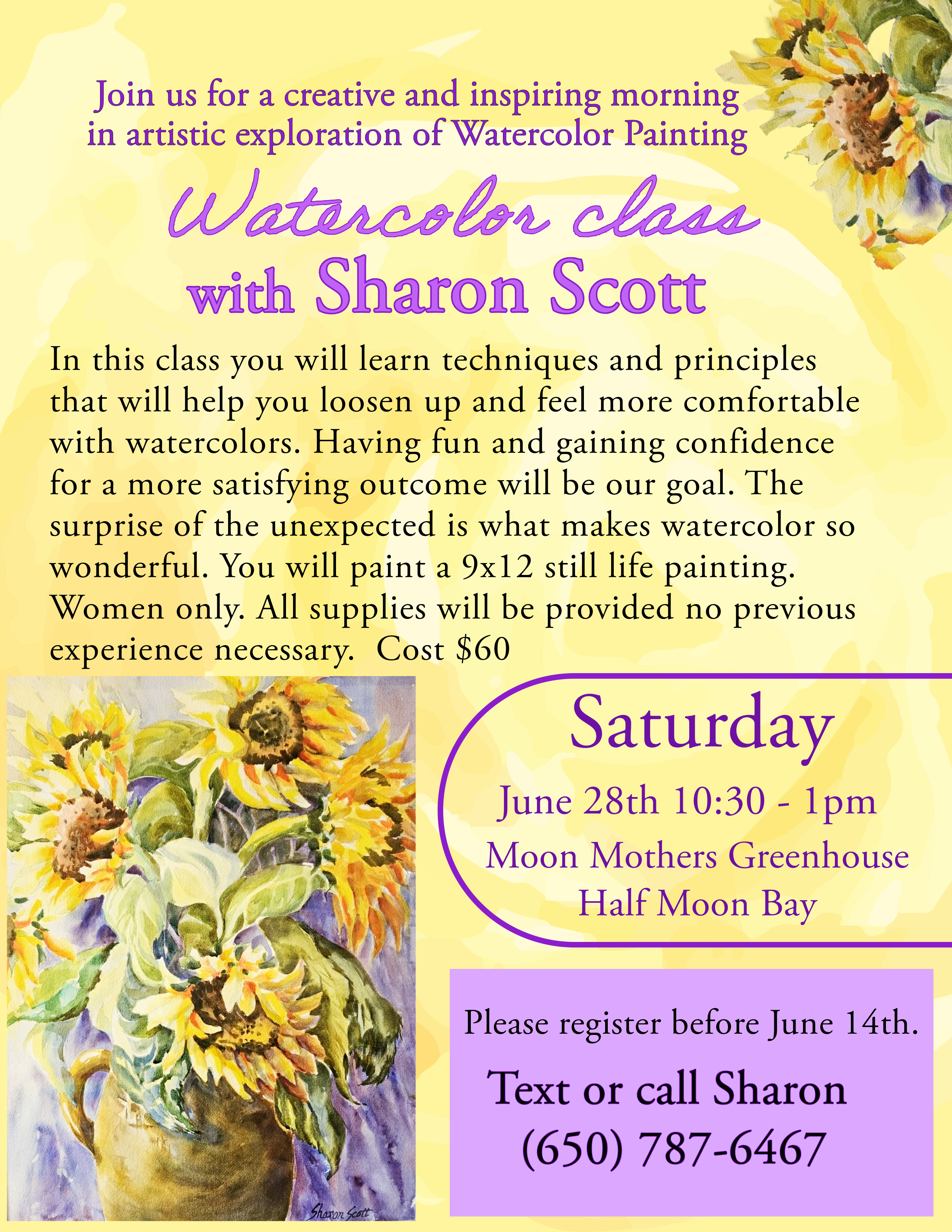 I am happy to announce an upcoming watercolor painting class with Sharon Scott. Many of you want another painting class. I found the Coastside’s best watercolor artist to teach in the Greenhouse.