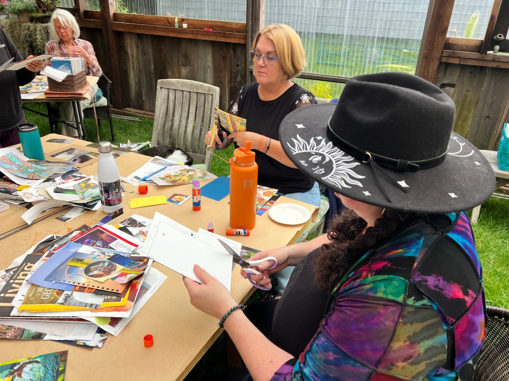 A rare all-day August rain turned our SoulCollage gathering into something dreamlike. Beneath the great shade tree, raindrops burst onto the Greenhouse roof like “heavenly applause” as we created together. The sound, the laughter, and the shared creativity made the day feel beautifully surreal.
