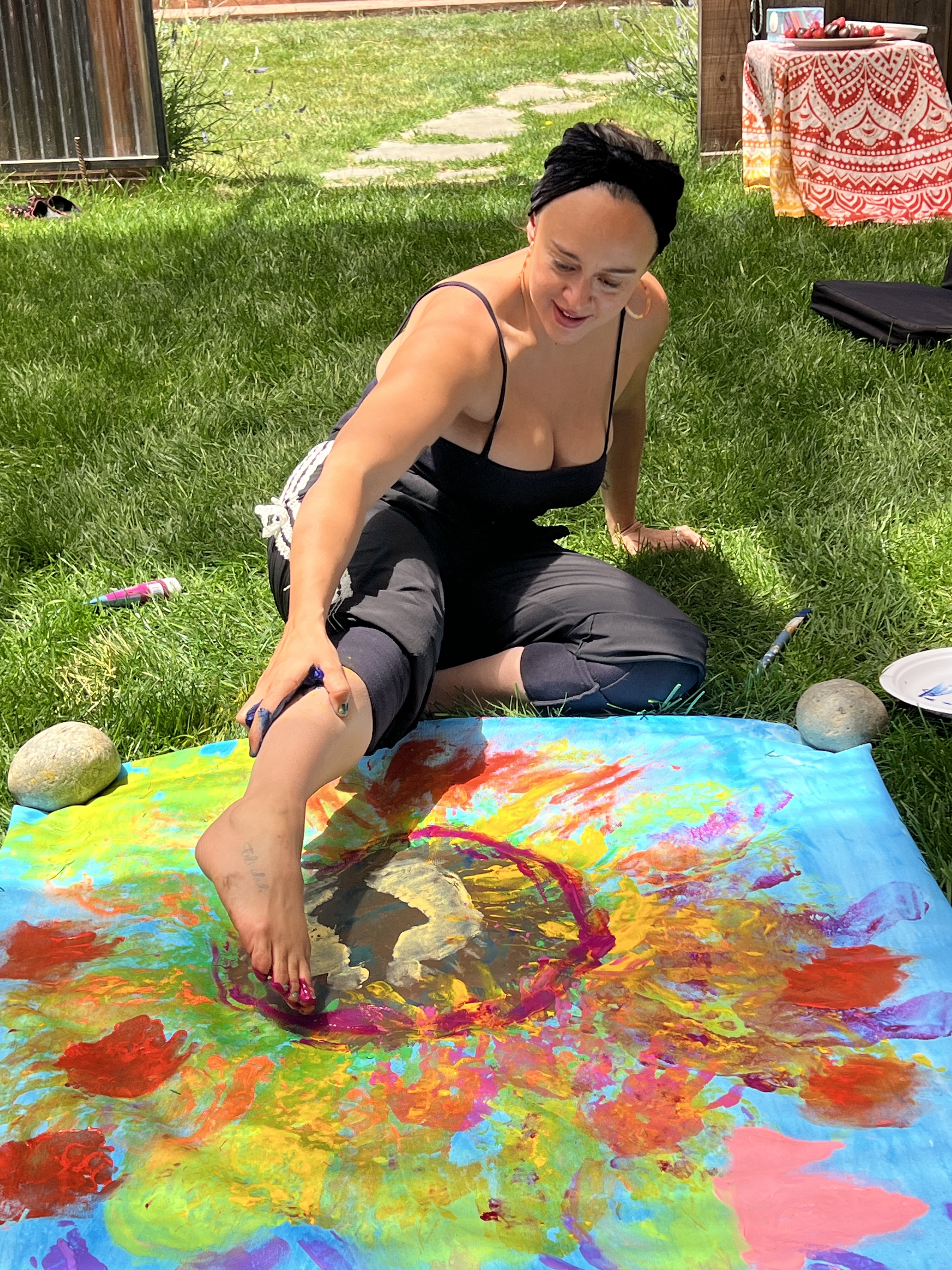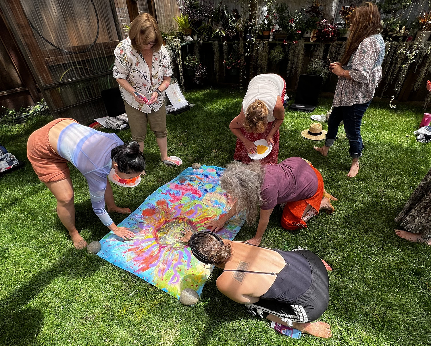 At the Summer Solstice, we paused together in a soft, feminine retreat dedicated to Aphrodite. In that warm circle, we heightened our senses through simple, relaxing rituals and even created a shared 3’x6’ painting using only our hands and feet — a playful way to honor grace, sensuality, and creative flow. It was a tender mid-year moment, inviting us to slow down, feel deeply, and welcome the sweetness of summertime as we stepped gently into the second half of the year.