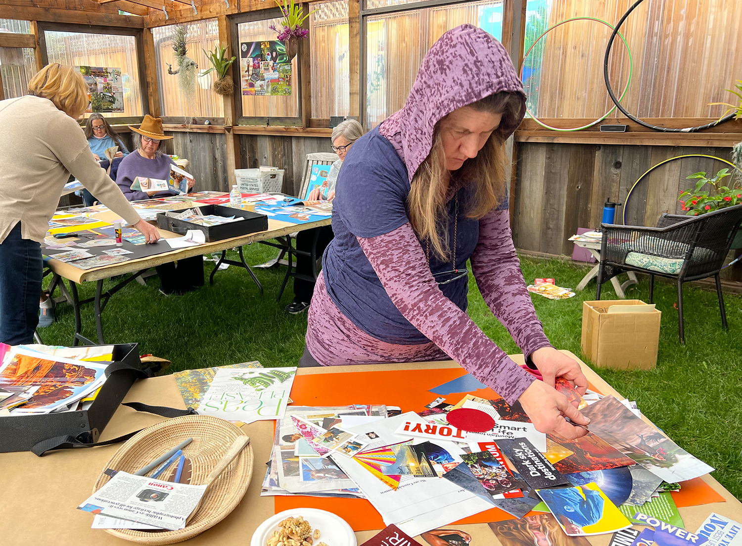 A rare all-day August rain turned our SoulCollage gathering into something dreamlike. Beneath the great shade tree, raindrops burst onto the Greenhouse roof like “heavenly applause” as we created together. The sound, the laughter, and the shared creativity made the day feel beautifully surreal.