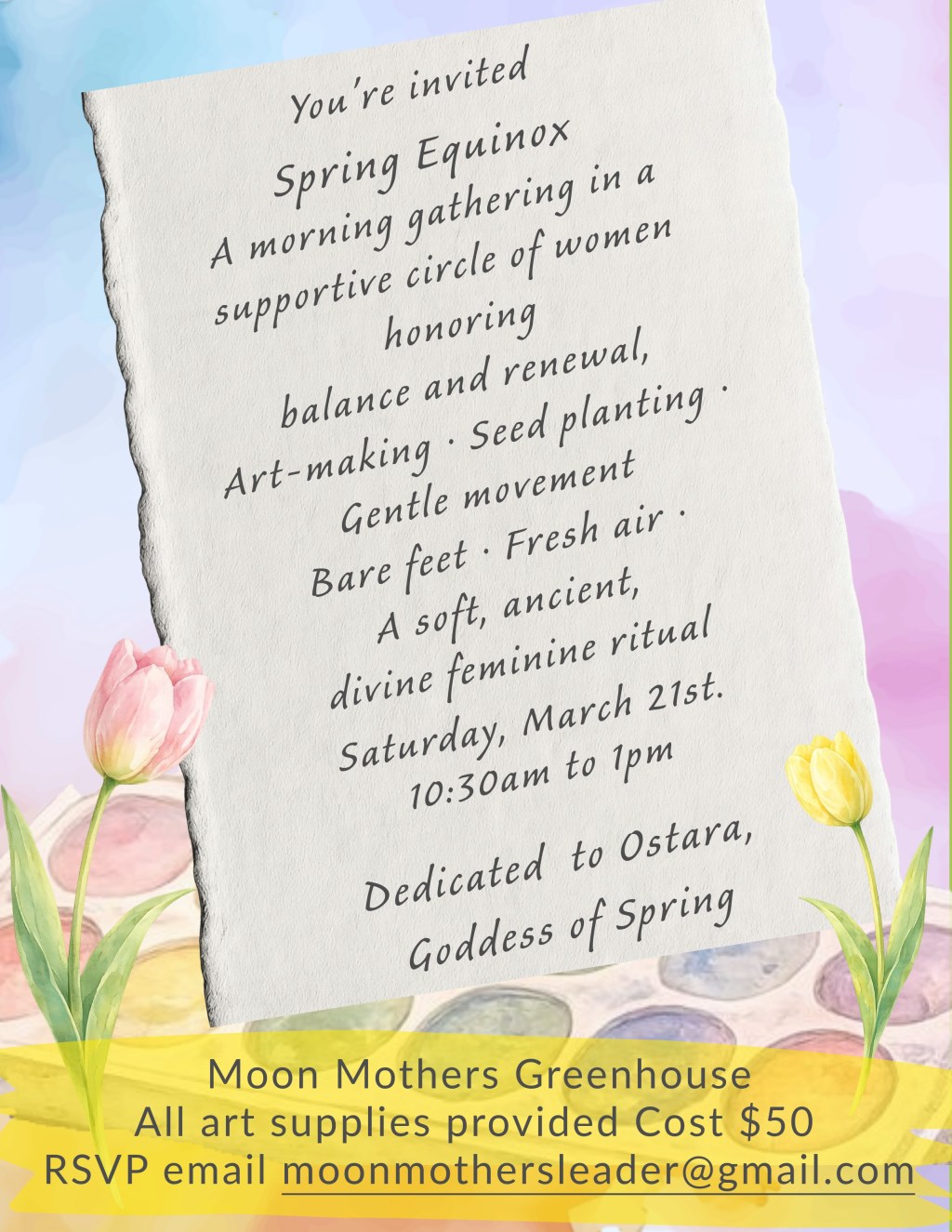Let’s gather in circle to honor this turning of the season with divine feminine ritual, art, and movement, welcoming the arrival of spring.