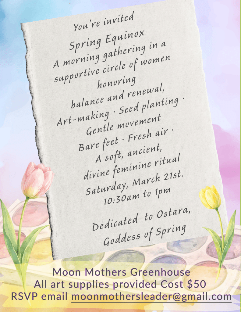 We will gather in circle to honor the balance of the season, through ritual, art-making, seed planting, and gentle movement — welcoming spring with creative hands and bare feet on the earth.