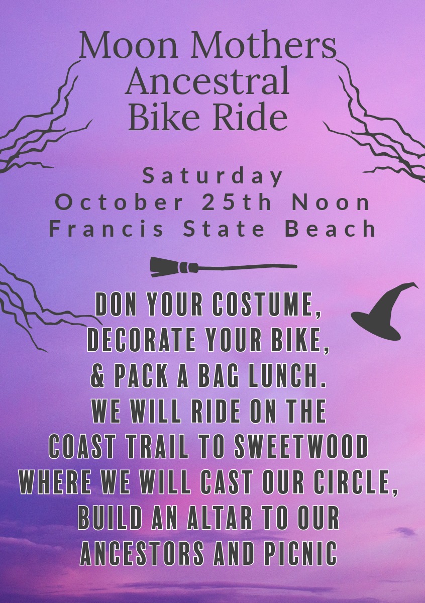 High noon, we will gather at Francis Beach. From Francis State Beach, (at the end of Kelly Ave)., we will take an easy, flat bike ride to Sweetwood. There, we will cast our circle in honor of our ancestors, hold a ceremony, and eat lunch. This will be a fun and sacred gathering. Dress in costume and decorate your bike.